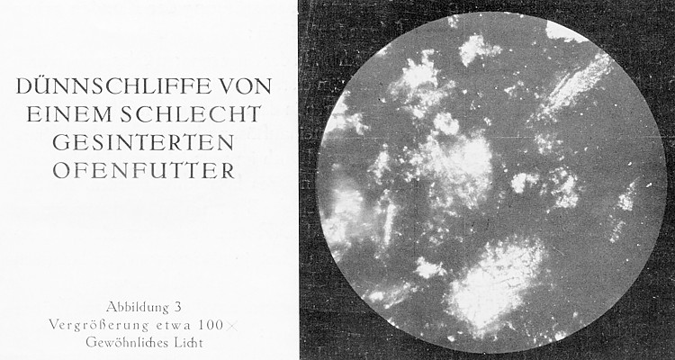 Die Abbildungen 1 und 2 zeigen einen Dünnschliff von einem gut gesicherten Ofenfutter in gewöhnlichem und in polarisiertem Licht. Die graumelierten Stellen im gewöhnlichen (Bild 1) und erst recht die graue Farbe im polarisierten Licht (Bild 2) deuten darauf hin, daß der Quarz vollkommen in Cristobalit übergegangen ist. In den dunklen Streifen (Bild 1) zwischen den einzelnen Körnchen sind Mullitnädelchen zu erkennen, die aus dem Bindeton auskristallisiert sind und die mechanische Festigkeit bedeutend erhöhen.